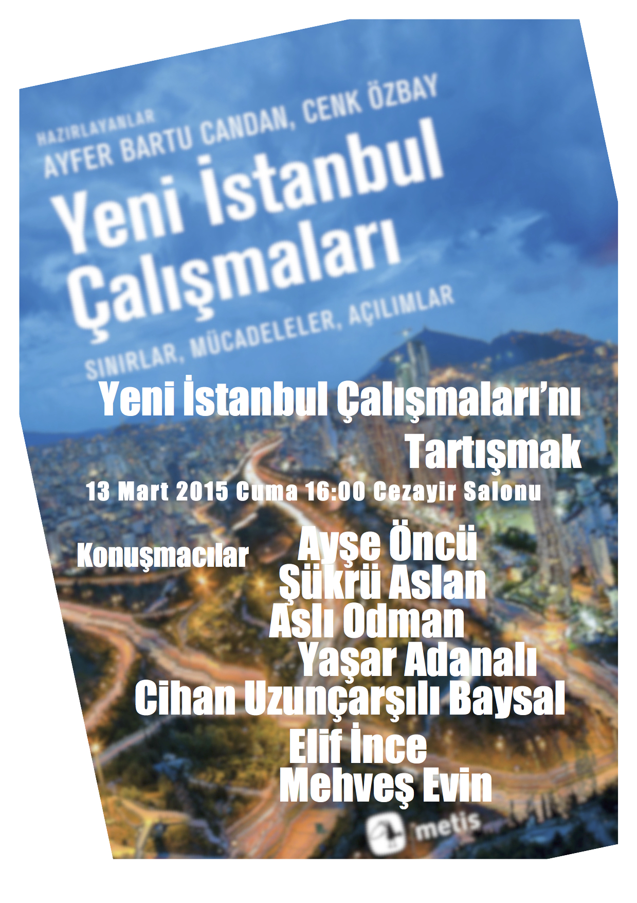 YENİ İSTANBUL ÇALIŞMALARIKasım 2014’te Metis Yayınları tarafından yayımlanan Yeni İstanbul Çalışmaları kitabını konu alan bir panel ve tartışma toplantısı düzenliyoruz. Toplantıyla kitabı değerlendirmek ve kent araştırmalarının çeşitli veçhelerini tartışmak amaçlanıyor. Toplantıya Ayşe Öncü (Sabancı Univ.) Șükrü Aslan (Mimar Sinan GS Üniv.) Aslı Odman (Mimar Sinan GS Üniv.) Yaşar Adanalı (Berlin Teknik Üniv.) Cihan Uzunçarşılı Baysal (Istanbul Kent Hareketleri) Mehves Evin (Milliyet Gazetesi) ve Elif İnce (Bianet) konuşmacı olarak katılacaklar. Toplantı herkese açık, ancak salon yer sayısıyla sınırlıdır.13 Mart Cuma, saat: 16:00-19:00