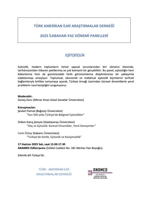 Eşitsizlik, modern toplumların temel yapısal sorunlarından biri olmanın ötesinde, tarihöncesinden itibaren şekillenmiş ve çok katmanlı bir gerçekliktir. Bu panel, eşitsizliğin hem kökenlerine hem de günümüzdeki farklı görünümlerine disiplinlerarası bir yaklaşımla odaklanmayı amaçlıyor. Toplumsal, ekonomik ve mekânsal eşitsizlik biçimlerini tarihsel bağlamlarıyla birlikte tartışmaya açarak, Türkiye örneği üzerinden küresel dinamiklerle yerel pratiklerin nasıl kesiştiğini sorguluyoruz.